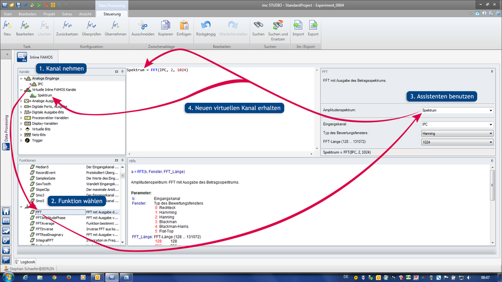 La biblioteca de funciones proporciona funciones predeterminadas de análisis a su alcance. La aplicación es muy sencilla: seleccionar el canal de medición, arrástrarlo a la función deseada y al instante recibirá un resultado cálculado. Varios pasos de cálculo se almacenan en un editor como una secuencia y pueden ser claramente editados y cargados en proyectos futuros y resutilizables.
