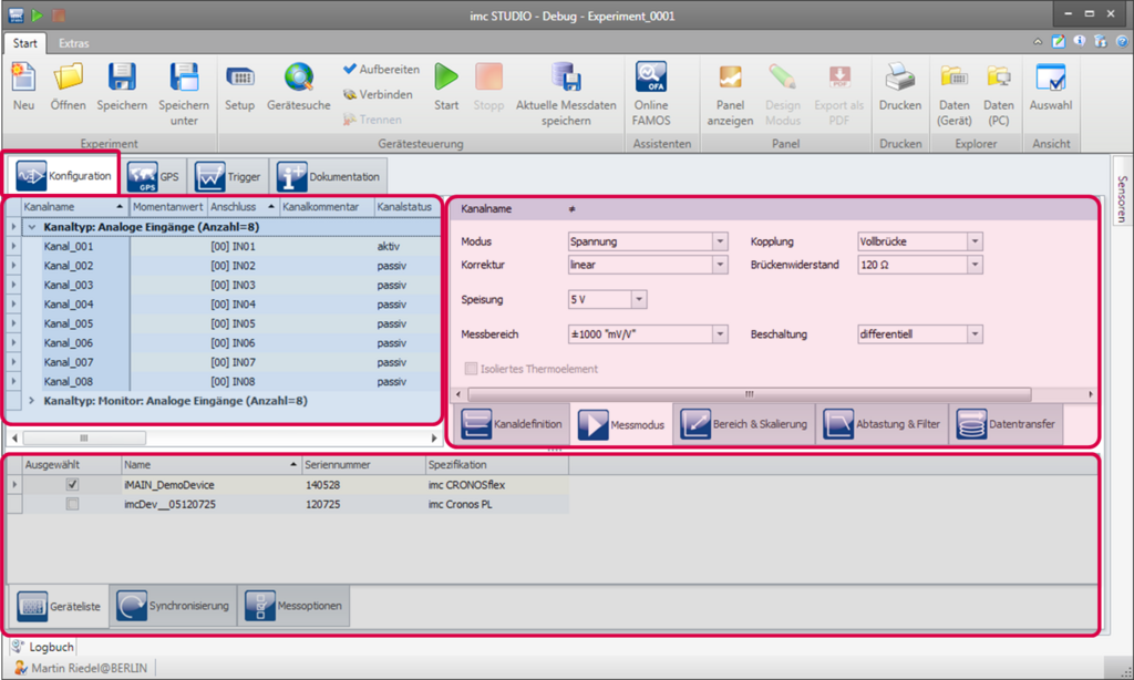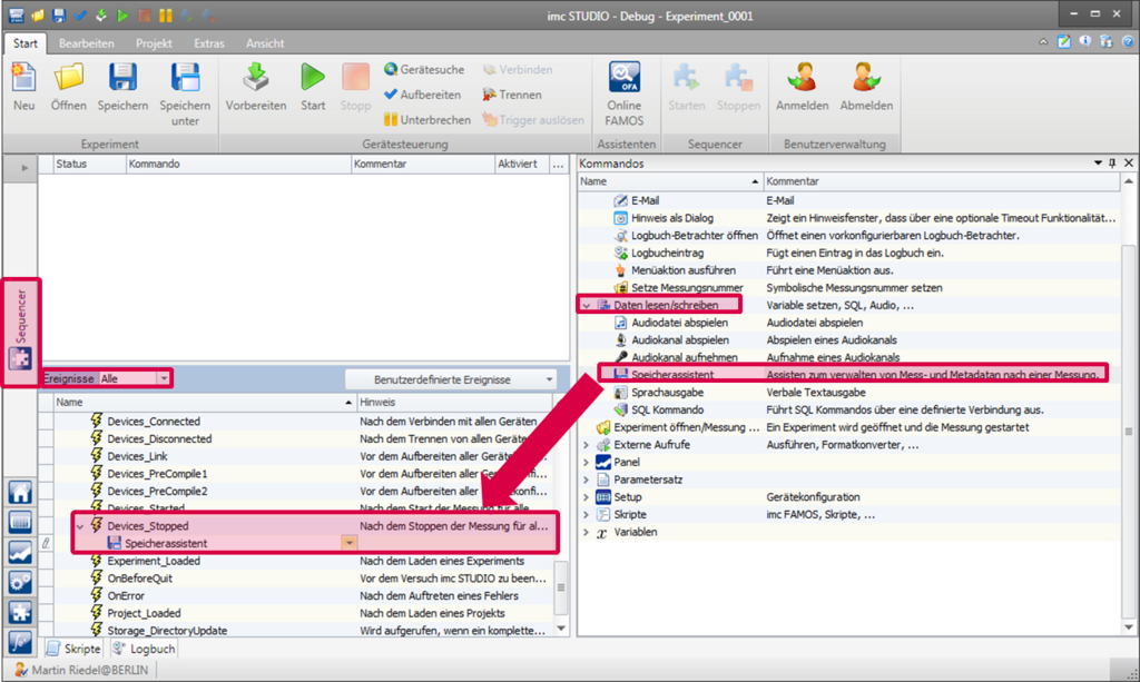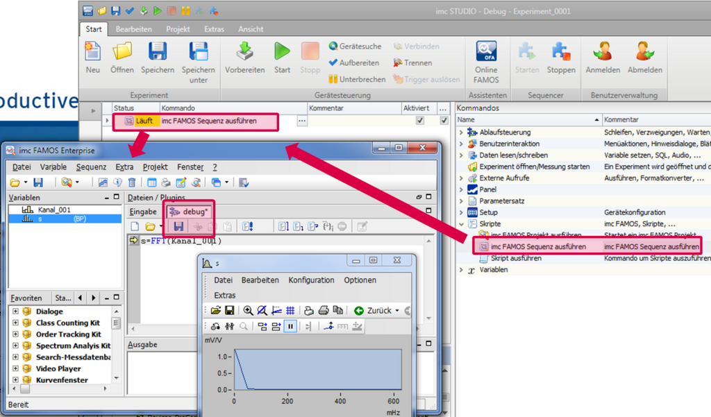 La idea de integrar imc FAMOS para automatizar el análisis de datos a través de secuencias se ha mejorado: por medio de la nueva "Debug-Mode" es posible ejecutar estas secuencias paso a paso, directamente con los últimos datos de la medición. Esto significa que todos los resultados provisionales están disponibles para el procesamiento y la visualización, lo que a su vez hace que sea mucho más fácil de revisar y desarrollar los algoritmos de análisis.