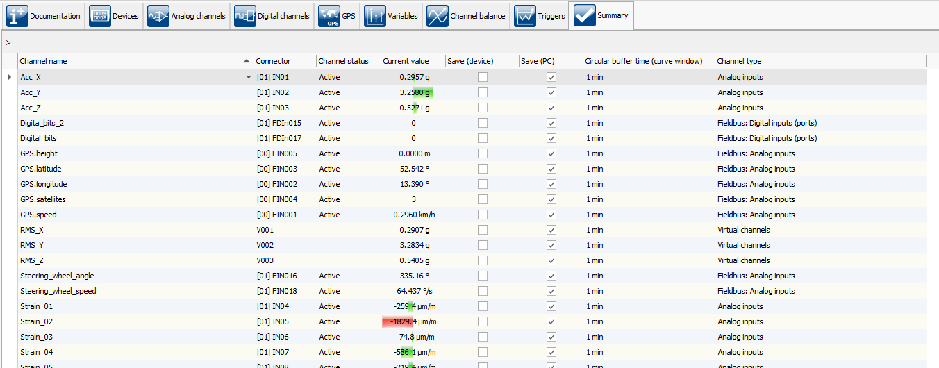 Für mehr Übersicht sorgt die neue Konfigurationsseite “Zusammenfassung”. Unabhängig vom Kanaltyp, zeigt diese alle konfigurierten Kanäle inklusive Momentanwert, Übersteuerungsanzeige und Speichereinstellung. So hat der Anwender die wichtigsten Daten auf einer Seite im Blick, ohne zwischen verschiedenen Seiten wechseln zu müssen.